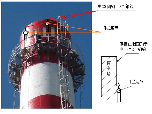 頂部掛鉤點支撐:利用Φ20圓鋼S形鋼鉤上端與頂部爬梯M24的預(yù)埋膨脹螺栓連接下端與1.5t葫蘆(滑輪)連接。